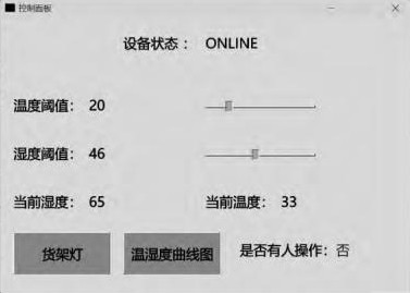 PC端桌面应用,可实时显示设备状态、温、湿度数值及其阈值,如图10所示,并同步至华为云平台;当温度大于所设阈值时,货架风扇将开启运行;当湿度低于设定阈值时,则加湿器启动运行。