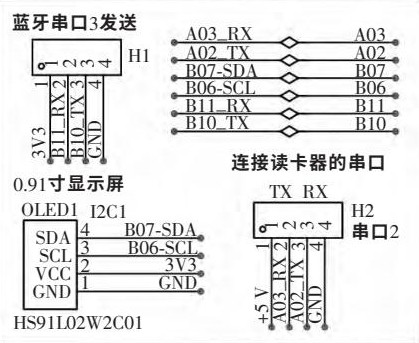 RFID手持机以STM32为控制单元,串口连接RFID读卡器,主板连接蓝牙和RFID模块,分别用于无线通信和电子标签数据读取。手持机电路设计如图3所示,配备0.91英寸OLED条形屏和LED灯,用于显示和指示工作状态;还板载蜂鸣器,以成功读取电子标签后发出提示音。读卡器选用超高频RFID模块,型号CPH-305/307,具备非接触式快速盘存,可根据厂家提供的通信协议自定义开发。